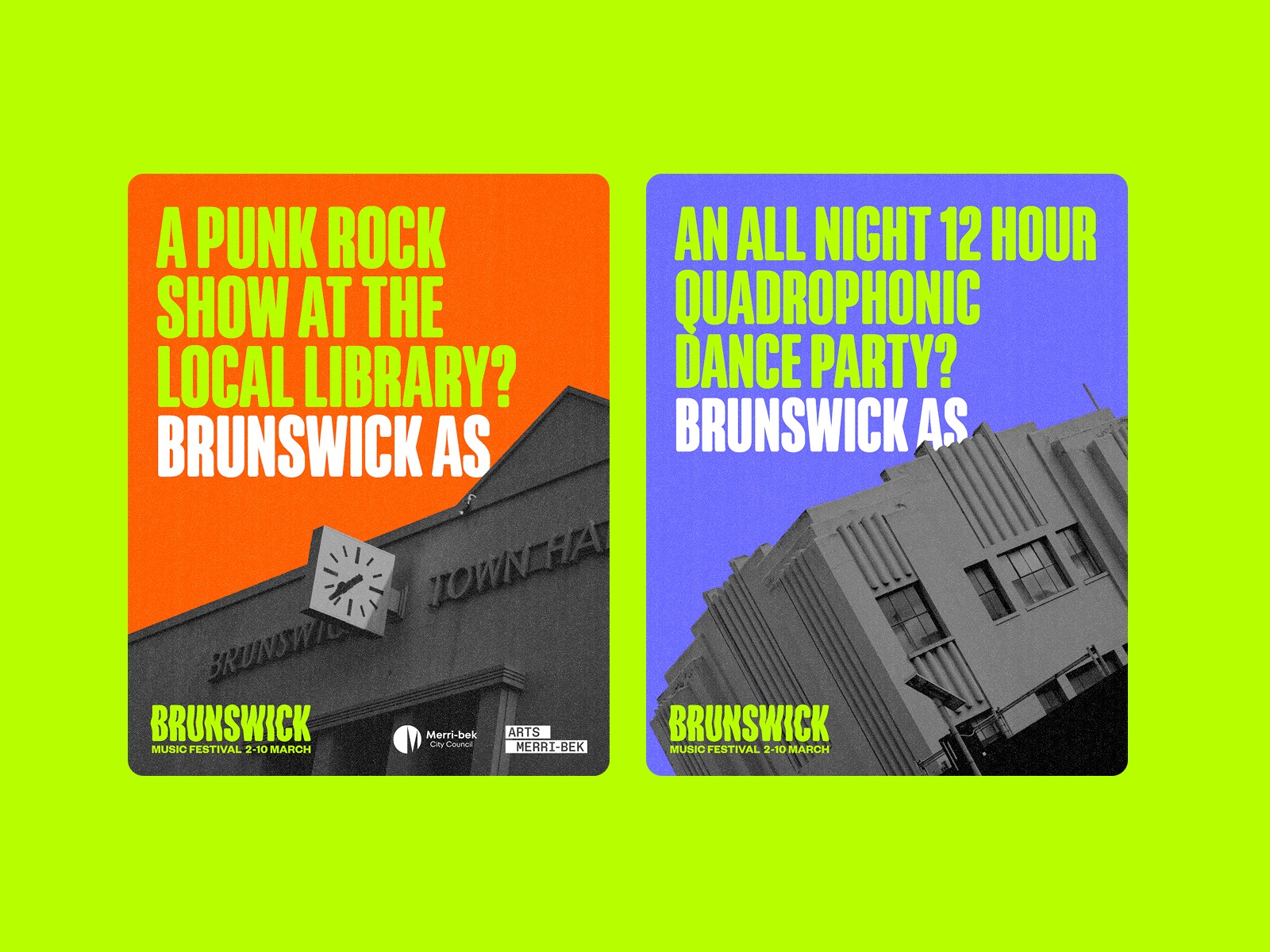 I have now worked on the Brunswick Music Festival for its third year, partnering with the Merribek festival team and the creative legends at Deathproof. I led a full brand overhaul, exploring a high contrast colour palette, punchy type treatments, and bold repetition in forms and scale. The design approach was built with accessibility in mind, ensuring high visibility and legibility across all formats. Dark, cropped, and rotated imagery plays off the colours to create dynamic, high impact visuals across both print and digital. Across the festival, I designed over 100 assets including street posters, billboards, wayfinding signage, gig lineups, merch, social media assets, Canva templates, videos, and HTML display ads. The consistent, accessible aesthetic helped unify the festival’s presence, reinforcing its bold, eclectic, community first spirit.